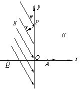 (20分)如图所示,直角坐标系在一真空区域里,y轴的左方有一匀强电场,场强方向跟y轴负方向成θ=30º角,y轴右方有一垂直于坐标系平面的匀强磁场,在x轴上的A点有一质子发射器,它向x轴的正方向发射速度大小为v=2.0×106m/s的质子,质子经磁场在y轴的P点射出磁场,射出方向恰垂直于电场的方向,质子在电场中经过一段时间,运动到x轴的Q点。已知A点与原点O的距离为10cm,Q点与原点O的距离为(20