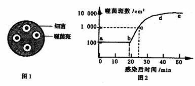 7.噬菌斑(如下图1)是在长满细菌的培养基上,由一个噬菌体侵染细菌后不断裂解细菌后产生的一个不长细菌的透明小圆区,它是检出噬菌体数量的重要方法之一。现利用连续取样、在培养基中培养的方法测得T4噬菌体在感染大肠杆菌后数量变化曲线(下图2),下列有关该曲线的叙述中正确的是 ( )