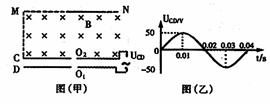 25.(18分)如下图甲所示,真空中两水平放置的平行金属板C、D,上面分别开有正对的小孔O1和O2,金属板C、D接在正弦交流电源上,C、D两板间的电压UCD随时间t变化的图线如图(乙)所示。t=0时刻开始,从D板小孔O1处连续不断飘入质量为m=3.2×10-25kg、电荷量q=1.6×10-19C的带正电的粒子(设粒子飘入速度很小,可视为零)。在C板外侧有以MN为上边界CM为左边界的匀强磁场,MN与C金属板相距d=10cm,O2C的长度L=10cm,匀强磁场的大小为B=0.1T,方向如图(甲)所示,粒子的重力及粒子间相互作用力不计,平行金属板C、D之间的距离足够小,粒子在两板间的运动时间可忽略不计。求: