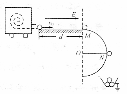 23.(16分)某塑料球成型机工作时,可以喷出速度v0=10m/s的塑料小球,已知喷出的每个小球的质量m=1.0×10-4kg,并且在时喷出时已带了q=-1.0×10-4C的电荷量。如图所示,小球从喷口飞出后,先滑过长d=1.5m的水平光滑的绝缘轨道,而后又过半径R=0.4m的圆弧形竖立的光滑绝缘轨道。今在水平轨道上加上水平向右的电场强度大小为E的匀强电场,小球将恰好从圆弧轨道的最高点M处水平飞出;若再在圆形轨道区域加上垂直纸面向里的匀强磁场后,小球将恰好从圆弧轨道上与圆心等高的N点脱离轨道,最后落入放在地面上接地良好的金属容器内,g=10m/s2,求:
