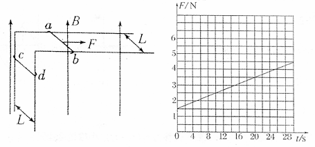 24.(18分)相距为L=0.20m的足够长的金属直角导轨如图所示放置,它们各有一边在同一水平面内,另一边垂直于水平面。质量均为m=1.0kg的金属细杆ab、cd与导轨垂直接触形成闭合回路,杆与导轨之间的动摩擦因数均为μ,导轨电阻不计,回路总电阻为R=1.0Ω。整个装置处于磁感应强度大小为B=0.50T,方向竖直向上的匀强磁场中。当ab杆在平行于水平导轨的拉力F作用下从静止开始沿导轨匀加速运动时,cd杆也同时从静止开始沿导轨向下运动。测得拉力F与时间t的关系如图所示。g=10m/s2,求: