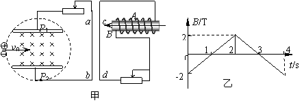 21.等离子气流由左方连续以v0射入P1和P2两板间的匀强磁场中,ab直导线与P1、P2相连接,线圈A与直导线cd连接.线圈A内有随图乙所示的变化磁场,且磁场B的正方向规定为向左,如图甲所示,则下列叙述正确的是