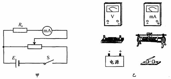 (3)为了研究某电阻元件Rx的伏安特性,某同学设计了图甲所示的电路,图中电流表mA的量程为5 mA,内阻约为10Ω;电压表V(已接入电路但图中未画出)量程为3V,内阻约为3 kΩ;电源电动势E为6V,内阻不计。