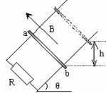 (18分)两根金属导轨平行放置在倾角为θ=30°的斜面上,导轨左端接有电阻R=10Ω,导轨自身电阻忽略不计.匀强磁场垂直于斜面向上,磁感强度B=0.5T.质量为m=0.1kg,电阻不计的金属棒ab由静止释放,沿导轨下滑.如图所示,设导轨足够长,导轨宽度L=2m,金属棒ab下滑过程中始终与导轨接触良好,当金属棒下滑高度h=3m时,速度恰好达到最大速度2m/s.求这一过程中,(1)金属棒受到的最大安培力; (2)电路中产生的电热.