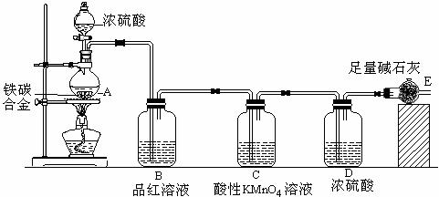 (2)将ag铁碳合金样品放入A中,再加入适量的浓硫酸,未点燃酒精灯前,A.B基本上均无明显现象,其原因是:____ _______________;加热A一段时间后,A.B中可观察到明显的现象,其中B中的现象___________________________,任写出一个A中发生反应的化学方程式____________________________。