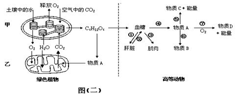 (6)图(二)中,发生在高等动物细胞结构乙中的生理过程是_______(填图中序号),在缺氧情况下,物质A可通过⑤过程形成物质C(填名称)___________。