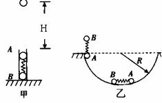 们整体视为质点),解除锁定后,A球能上升的最大高度为H。如图乙现让两球包括锁定的弹簧从水平面出发,沿光滑的半径为R=2H的半圆槽从左侧由静止开始下滑,滑至最低点时,瞬间解除锁定。