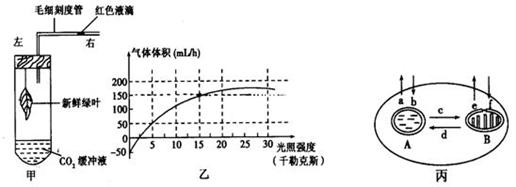 30、(20分)图中甲为测定光合作用速率的装置,在密封的试管内放一新鲜叶片和二氧化碳缓冲液,试管内气体体积的变化可根据毛细刻度管内红色液滴的移动距离测得。在不同强度的光照条件下,测得的气体体积如图乙所示。图丙为叶肉细胞中有关细胞器的结构模式图。植物叶片的呼吸速率不变。![]()