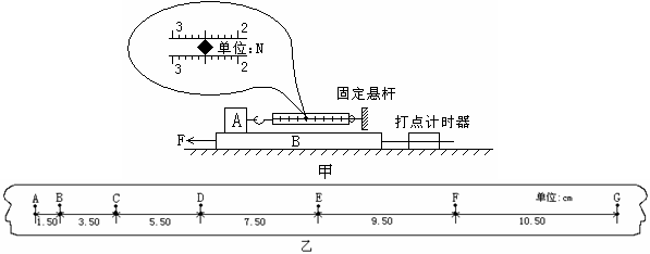 (2)该同学还设计将纸带连接在金属板B的后面,通过打点计时器连续打下一些计时点,测量后的结果如图乙所示,图中几个连续的计数点的时间间隔0.1s,由此可知B加速度a= m/s2,水平力F=_________N. (结果保留三位有效数字)