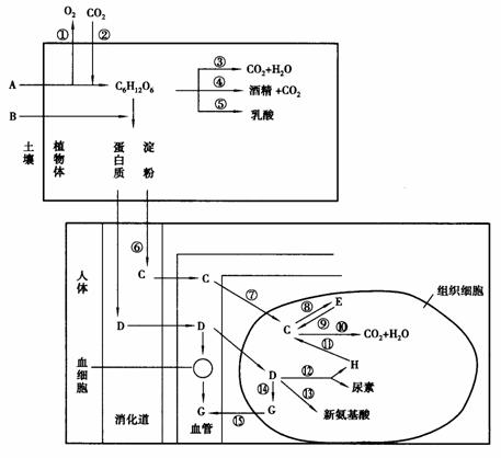 30.(24分)下图是绿色植物和人体代谢的部分过程示意图,其中A-G表示有关物质,①-15表示有关生理过程,请分析后回答下列问题: