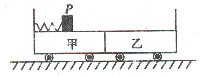 固定在甲车的左端,质量为m=1kg的滑块P(可视为质点)与弹簧的右端接触但不相连,乙车右端有一弹性挡板(与滑块碰撞时无机械能损失).此时弹簧的弹性势能E0=10J,弹簧原长小于甲车长度,整个系统处于静止状态.现剪断细线.
