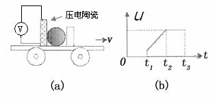 压电陶瓷是一种力电传感器,它两端电压随所受压力的增大而增大。有位同学利用压电陶瓷设计了判断小车运动状态的装置,其工作原理如图(a)所示,将压电陶瓷和一块挡板固定在绝缘小车上,中间放置一个绝缘重球,它的直径略小于陶瓷和挡板间的距离。小车向右做直线运动过程中,电压流表示数如图(b)所示,下列判断正确的是