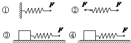 如图所示,四个完全相同的弹簧都水平位置,它们的右端受大小皆为F的拉力作用而左端的情况各不相同:①中弹簧的左端固定在墙上;②中弹簧的左端受大小也为F的拉力作用;③中弹簧的左端拴一小物块,物块在光滑的桌面上滑动;④中弹簧的左端拴一小物块,物块在有摩擦的桌面上滑动。若认为弹簧的质量都为零,以
