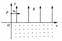 (22分)如图所示,在y>0的空间中,存在沿y轴正方向的匀强电场E;在y<0的空间中,存在垂直纸面向外的匀强磁场B,一电子在y轴正方向上距原点为d的P点以初速度v0沿x轴正方向开始运动,求电子的运动周期和电子在一周期内在x轴方向上运动的距离。
