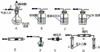 (1)若A装置中气体入口处通入CO和CO2的混合气体,E内放置CuO,选择装置获得纯净干燥的CO,并验证其还原性及氧化产物,所选装置的连接顺序为 (填代号) 。能验证CO氧化产物的现象是 。