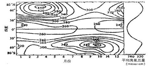 读“大气平均臭氧总量的季节变化和纬度分布示意图” (引自《大气科学辞典》), 就纬度而言,图中臭氧总量的极小值出现在( )