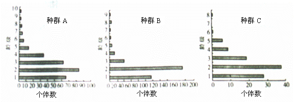 研究人员根据黄杉胸径的大小划分了不同龄级,对种群A(自然状态)和种群B、C(不同人为干扰强度)进行了取样调查,结果如下图。由此得出的结论不正确的是( )