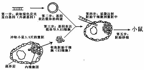 32.[生物 现代生物科技专题](10分) 英美三位科学家在胚胎干细胞研究方面的“基因靶向”技术获得2007年诺贝尔生理学或医学奖。下图为某科研小组采用该技术先将某海蜇的绿色荧光蛋白基因导入小鼠的胚胎干细胞(ES细胞)中,再将改造后的胚胎干细胞移植回囊胚,经胚胎移植继续发育成小鼠的过程。请据图分析回答: