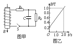 (20分)在如图甲所示的电路中,螺线管匝数n = 1500匝,横截面积S = 20cm2。螺线管导线电阻r = 1.0Ω,R1 = 4.0Ω,R2 = 5.0Ω,C=30μF。在一段时间内,穿过螺线管的磁场的磁感应强度B按如图乙所示的规律变化。求: