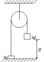 (20分)如图所示,一轻绳穿过光滑的定滑轮,两端各拴一小物块,它们的质量分别为m、M,已知M=3m,起始时m放在地上,M离地面高度为H=2.5m,绳子处于拉直状态,然后由静止释放M,设物块与地面相碰时完全没有弹起(地面为水平沙地),绳不可伸长,绳中各处拉力均相同,在绳突然绷直提拉物块时绳的速度与物块相同,试求: