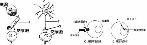(4)近年来,对胰岛素作用机制的研究进一步深入,对其作用的信号通路已比较清楚。A、B所示细胞通讯方式为人体内常见的两种不同类型的信号分子及其信号传导方式,C、D表示不同的信号分子对靶细胞作用的方式。据下图分析,符合胰岛素作用信号通路是图中的_____________________