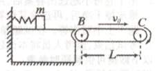 (17分)如图,质量为m的滑块,放在光滑的水平平台上,平台右端B与水平传送带相接,传送带的长为L,运行速度恒为v0。今将滑块缓慢向左压缩固定在平台上的轻弹簧,到达某处时突然释放,当滑块滑到传送带右端C时,恰好与传送带速度相同,滑块与传送带间的动摩擦因数为μ。