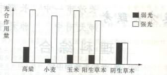 4.在适宜的温度、水分和coz条件下,分别测定强光和弱光时不同植物的光合作用量如下图所示,请据此判断,下列叙述不正确的是 (D)