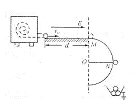 23.(16分)某塑料球成型机工作时,可以喷出速度v0=10m/s的塑料小球,已知喷出的每个小球的质量m=1.0×10-4kg,并且在时喷出时已带了q=-1.0×10-4C的电荷量。如图所示,小球从喷口飞出后,先滑过长d=1.5m的水平光滑的绝缘轨道,而后又过半径R=0.4m的圆弧形竖立的光滑绝缘轨道。今在水平轨道上加上水平向右的电场强度大小为E的匀强电场,小球将恰好从圆弧轨道的最高点M处水平飞出;若再在圆形轨道区域加上垂直纸面向里的匀强磁场后,小球将恰好从圆弧轨道上与圆心等高的N点脱离轨道,最后落入放在地面上接地良好的金属容器内,g=10m/s2,求: