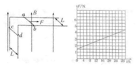 24.(18分)相距为L=0.20m的足够长的金属直角导轨如图所示放置,它们各有一边在同一水平面内,另一边垂直于水平面。质量均为m=1.0kg的金属细杆ab、cd与导轨垂直接触形成闭合回路,杆与导轨之间的动摩擦因数均为μ,导轨电阻不计,回路总电阻为R=1.0Ω。整个装置处于磁感应强度大小为B=0.50T,方向竖直向上的匀强磁场中。当ab杆在平行于水平导轨的拉力F作用下从静止开始沿导轨匀加速运动时,cd杆也同时从静止开始沿导轨向下运动。测得拉力F与时间t的关系如图所示。g=10m/s2,求: