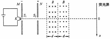 25.(20分)如图所示,M、N为两块带等量异种电荷的平行金属板,S1、S2为板上正对的小孔,N板右侧有两个宽度均为d的匀强磁场区域,磁感应强度大小均为B,方向分别垂直于纸面向里和向外,磁场区域右侧有一个荧光屏,取屏上与S1、S2共线的O点为原点,向下为正方向建立x轴.M板左侧电子枪发射出的热电子经小孔S1进入两板间,电子的质量为m,电荷量为e,初速度可以忽略.