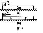 滑上木板左端,恰能滑至木板右端且与木板保持相对静止,滑块运动中所受的摩擦力始终不变,。若将木板分成长度与质量均相等的两段A、B后紧挨着放在同一水平面上,让小滑块仍以相同的初速度v0由木板A的左端开始运动,如图5(b)所示,则下列说法正确的是( )