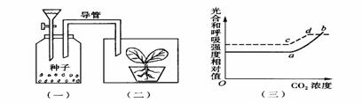 (1)如图(一)和(二)所示,由漏斗向种子瓶内加入少量水后(图中a点),(三)的曲线发生了变化。据图回答: