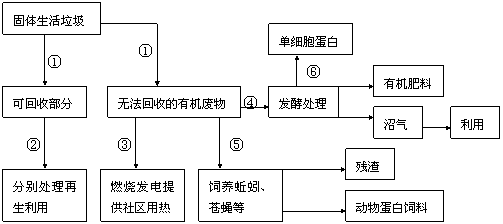 (2)垃圾实在是被人们放错了地方的资源,实现垃圾的“减量化、资源化和无害化”是绿色城市的重要标志之一。下图是垃圾资源化、无害处理的一种方案,此方案中①、②过程需要每一位市民的参与,具体做法是 。