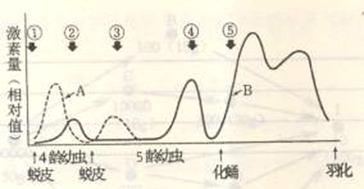31.昆虫变态是指其一生要经过卵、幼虫、蛹和成虫四个发育阶段。变态是与保幼激素和蜕皮激素有关的,两者共同作用时,保持幼虫状态并蜕皮成下一龄幼虫;而当保幼激素分泌量减少后就化蛹。家蚕发育到四龄末就吐丝结茧和化蛹,蛹再羽化成为成虫。超龄期的幼虫体大,所结的茧大,产丝也多。下图家蚕丛4龄到羽化阶段①~⑤时期体内二种激素量的变化。昆虫学家已经找到一种具有激素A活性的人工合成物质C和能抑制激素A生物合成的物质D,并已经应用于农业生产。据图分析回答:(11分)