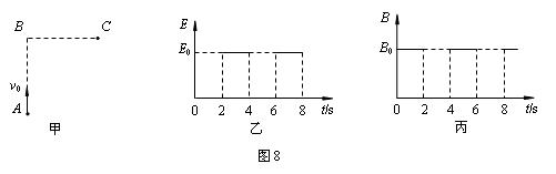 18.如图18甲所示,在空间存在一个变化的电场和一个变化的磁场,电场的方向水平向右(图18甲中由B到C),电场强度的大小随时间变化情况如图18乙所示;磁感应强度方向垂直于纸面, 磁感应强度的大小随时间变化情况如图8丙所示。在t=1s时,从A点沿AB方向(垂直于BC)以初速度v0射出第一个粒子,并在此之后,每隔2s有一个相同的粒子沿AB方向均以初速度v0射出,射出的粒子均能击中C点。若AB=BC=l,且粒子由A运动到C的运动时间均小于1s。不计空气阻力及电磁场变化带来的影响,则以下说法正确的是( )