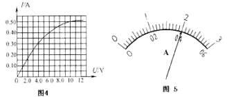 ④某位同学测得小灯泡的伏安特性曲线如图4所示。某次测量时,电流表指针位置如图5所示,电流表读数为 A,此时小灯泡的实际功率为 W。