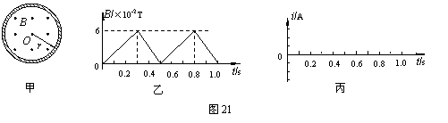 21.(19分)一个半径r=0.10m的闭合导体圆环,圆环单位长度的电阻R0=1.0×10-2 W×m-1。如图21甲所示,圆环所在区域存在着匀强磁场,磁场方向垂直圆环所在平面向外,磁感应强度大小随时间变化情况如图21乙所示。