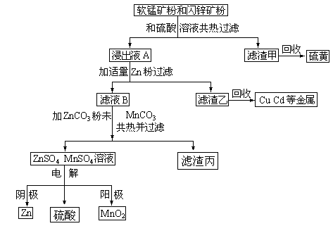 现在生产MnO2和锌的新工艺主要是通过电解获得MnO2和锌,副产品是硫、金属铜和镉。简化流程图如下: