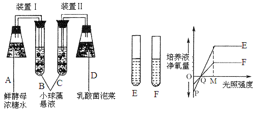 实验二:如果用图中E试管和F试管敞开口培养小球藻,E试管用完全培养液,F试管用缺镁的营养液,研究光照强度对E、F两试管中小球藻产生氧气量的影响,结果如右上坐标图,分别用相对应的E、F两曲线表示。据图回答: