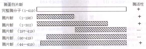 2.为探究酶X的活性部位,某科学家人工合成了五种不同长度的该酶片断,并分别测定其酶活性,结果如下图。(“+”表示酶具有活性:“一”表示酶不具有活性。酶X总长为419个氨基酸残基中,图数目代表氨基酸的编号,例如86-419代表酶x的第86号氨基酸到第419号氨基酸)