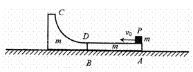 圆弧,它们紧靠在一起,如图所示。一个可视为质点的物块P,质量也为m,它从木板AB的右端以初速度v0滑入,过B点时速度为
