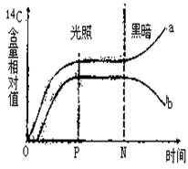 II(10分):下图表示C3植物的叶肉细胞在室温、一定的光照强度(N点后停止光照)条件下,O点开始提供14C标记的0.03%的CO2,叶肉细胞内C3和C5中14C含量相对值随时间变化曲线。分析回答: