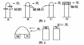D.图2中放M的胚芽鞘弯向一侧而放N的不弯曲