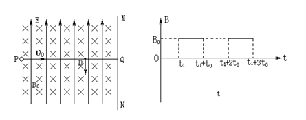 24.(20分)如图所示,与纸面垂直的竖直面MN的左侧空间中存在竖直向上场强大小为E的匀强电场(上、下及左侧无界).一个质量为m、电量为q=mg/E的可视为质点的带正电小球,在t=0时刻以大小为V0的水平初速度向右通过电场中的一点P,当t=t1时刻在电场所在空间中加上一如图所示随时间周期性变化的磁场,使得小球能竖直向下通过D点,D为电场中小球初速度方向上的一点,PD间距为L,D到竖直面MN的距离DQ为L/π.设磁感应强度垂直纸面向里为正.