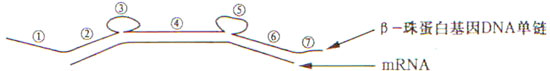 -珠蛋白基因与其mRNA杂交的示意图,①-⑦表示基因的不同功能区。