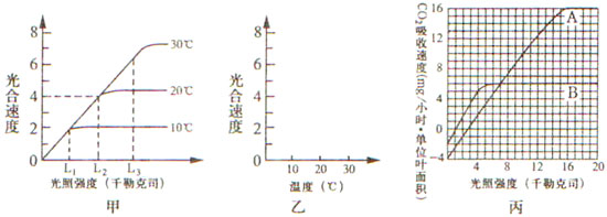 I.甲图表示在二氧化碳充足的条件下,某种植物光合速度与光照强度和温度的关系,丙图表示A、B两种植物的光合速度与光照强度的关系。请据图回答下列问题: