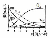 某研究性学习小组,为研究光化学烟雾消长规律,在一烟雾实验箱中,测得烟雾的主要成分为RH(烃)、NO、NO2、O3、PAN(CH3COOONO2),各种物质的相对浓度随时间的消失,记录于右图,根据图中数据,下列推论最不合理的是