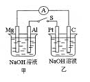 如右图所示,将两烧杯中电极用导线相连,四个电极分别为Mg.Al.Pt.C。当闭合开关S后,以下表述正确的是
