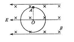 (16分)如图所示,在水平正交的匀强电场和匀强磁场B中,半径为R的光滑绝缘竖直圆环上,套有一个带电量为q带正电的小球,已知小球所受电场力与重力相等(重力加速度为g),小球在环顶端A点由静止释放,求小球所受磁场力最大值。