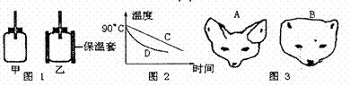 47,长期的自然选择使生物的形态、结构和生理功能都与其生存环境相适应。比如高纬度地 区动物的体形大,体表面积与其体积的比值小,皮下脂肪厚。有人设计了以下实验对此开 展研究:他将两个等容积的玻璃容器盛满900C的水(图1),乙外罩保温套,定期测量水 温变化,绘制成曲线(图2)。以下说法错误的是